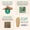 For the sole of our shoes, we use natural buffalo leather, which is renowned for its strength and resilience. This unique choice of material not only ensures long-lasting durability but also promotes a grounding effect. We enhance the conductivity by incorporating a copper rivet at the base, amplifying the flow of electrical energy.