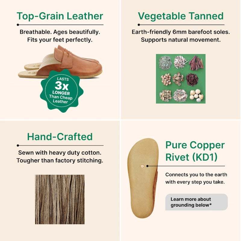 - Grounding Benefits: Our Earthing shoes, incorporate conductive materials like copper rivets and natural leather, enabling a connection to the Earth's energy. This grounding effect has been linked to potential health benefits, such as reduced inflammation, improved sleep, and increased overall well-being.